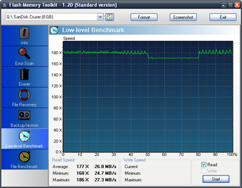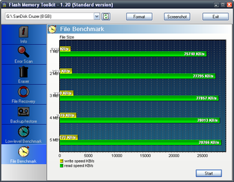 Flash Memory Toolkit dispose aussi d'outils d'analyse de performances dans la lignée de HD Tune, développé par la même équipe. Deux mode de mesure sont présents, le "Low-Level Benchmark" calcule les performances brutes en lecture et en écriture, tandis que le "File Benchmark" effectue le test pour des fichiers de 1 à 5 Mo.