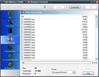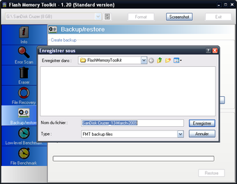 Des boutons sur la gauche de l'interface permettent d'accéder simplement aux autres fonctionnalités de Flash Memory Toolkit. Un outil de vérification d'erreurs - avec des tests de lecture et d'écriture-, un effaceur de fichiers -avec un mode rapide et un mode sécurisé-, un outil de récupération de fichiers effacés, et un outil de sauvegarde/restauration.